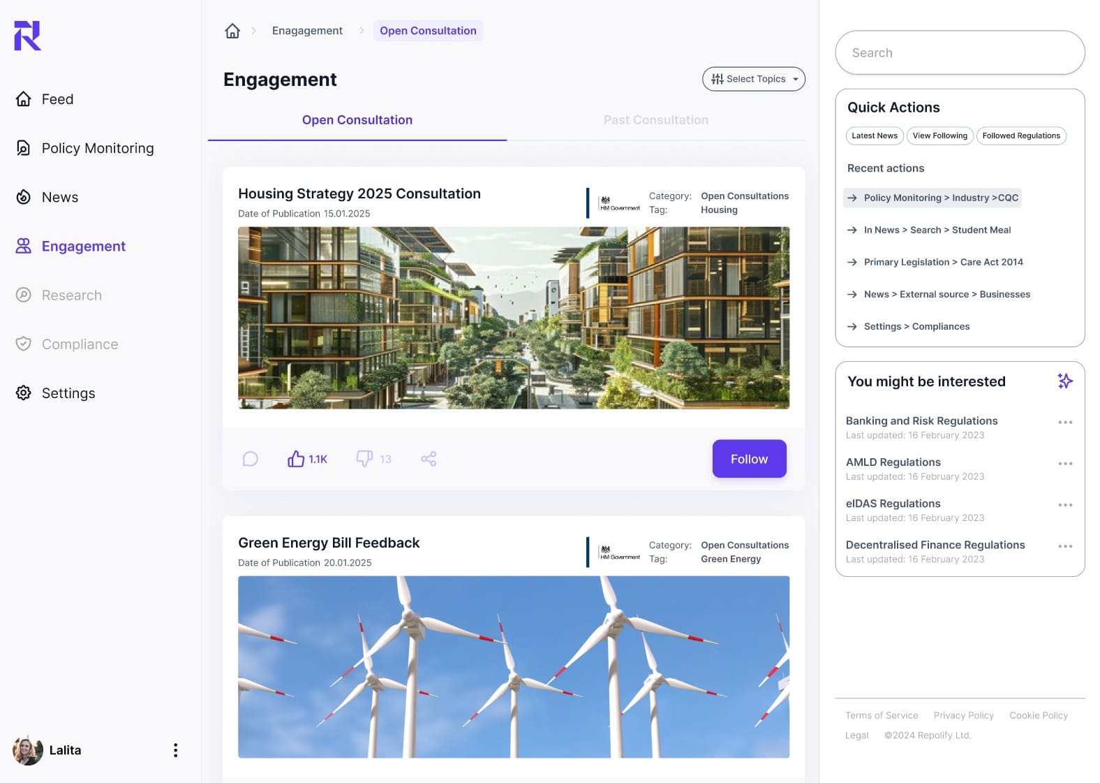 Repolify automates the tedious and costly process of monitoring laws and policy changes into a streamlined, efficient workflow, enabled by clear, tailored updates and user-friendly UI.