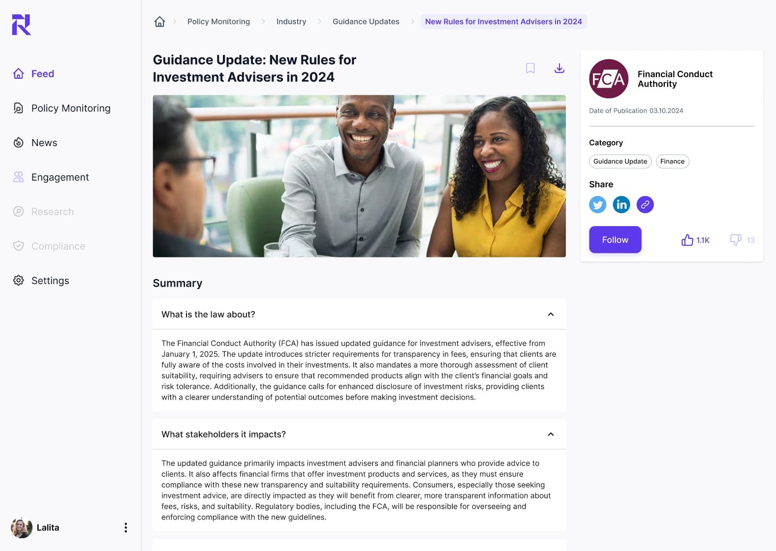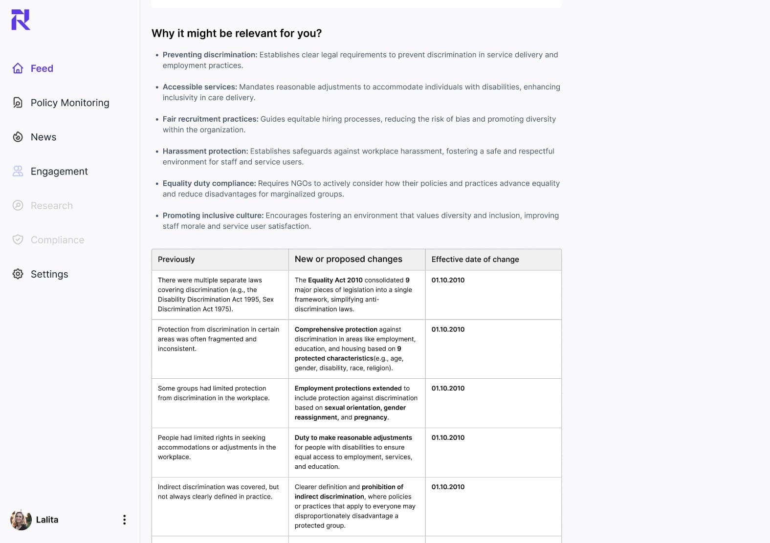 What sets us apart is our ability to deliver end-to-end value: we track, interpret, and operationalise regulatory change, so teams always know what changed, why it matters, and what to do next. The output always presents insightful, relevant, and actionable information within a user-friendly UI